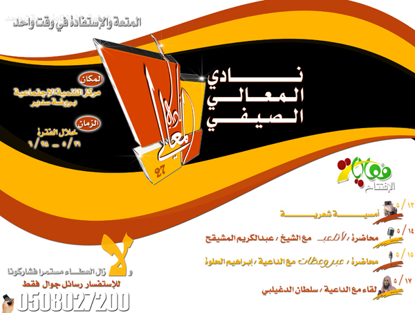 نادي المعالي الصيفي 1427هـ بروضة سدير هذا النادي هو امتداد للمراكز الصيفية المقامة في مدينة روضة سدير وبالاخص في مقر مركز التنمية الاجتماعية بروضة سدير وعلى هذا الرابط تجد فعاليات نادي المعالي الصيفي والمهرجان الدعوي الذي سبقه www.sudayr.com/vb