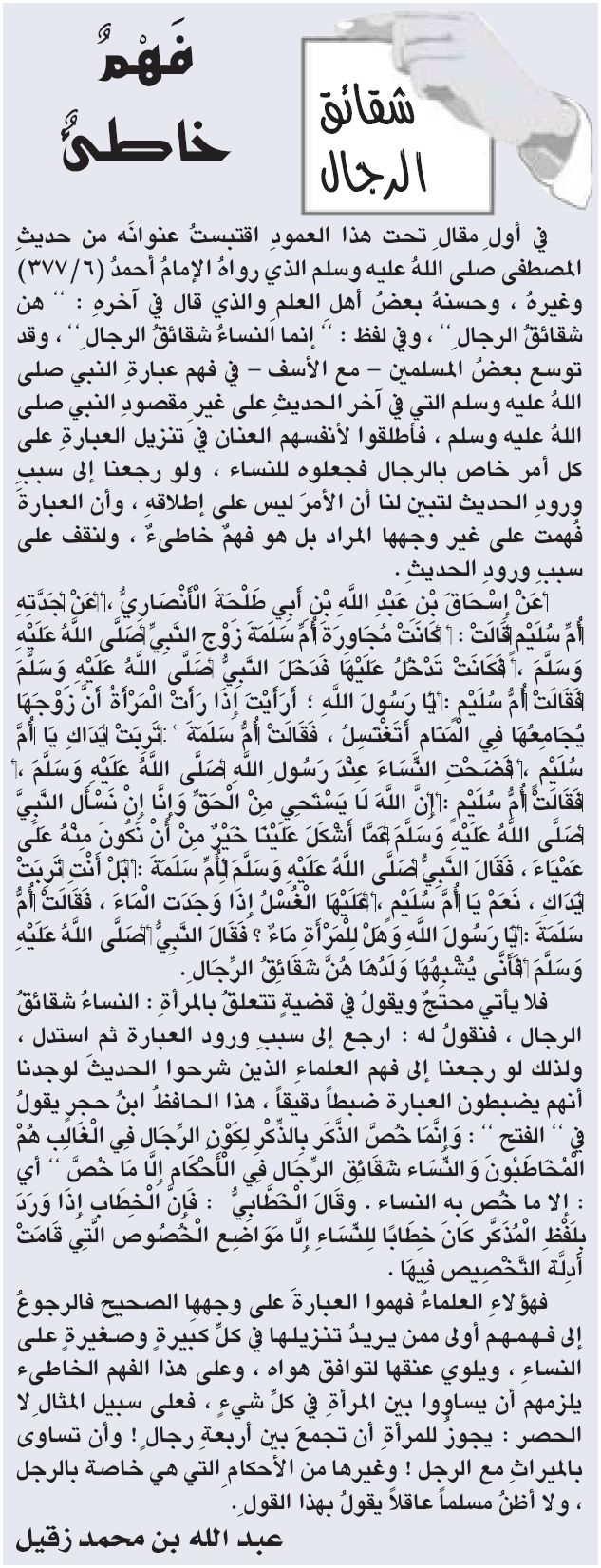 النساءُ شقائقُ الرجالِ '' ، وقد توسع بعضُ المسلمين - مع الأسف - في فهم