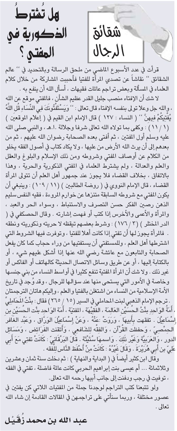 '' نقاشاً عن تصدي المرأة للفتيا فأحببت المشاركة من خلال كلام العلماء في