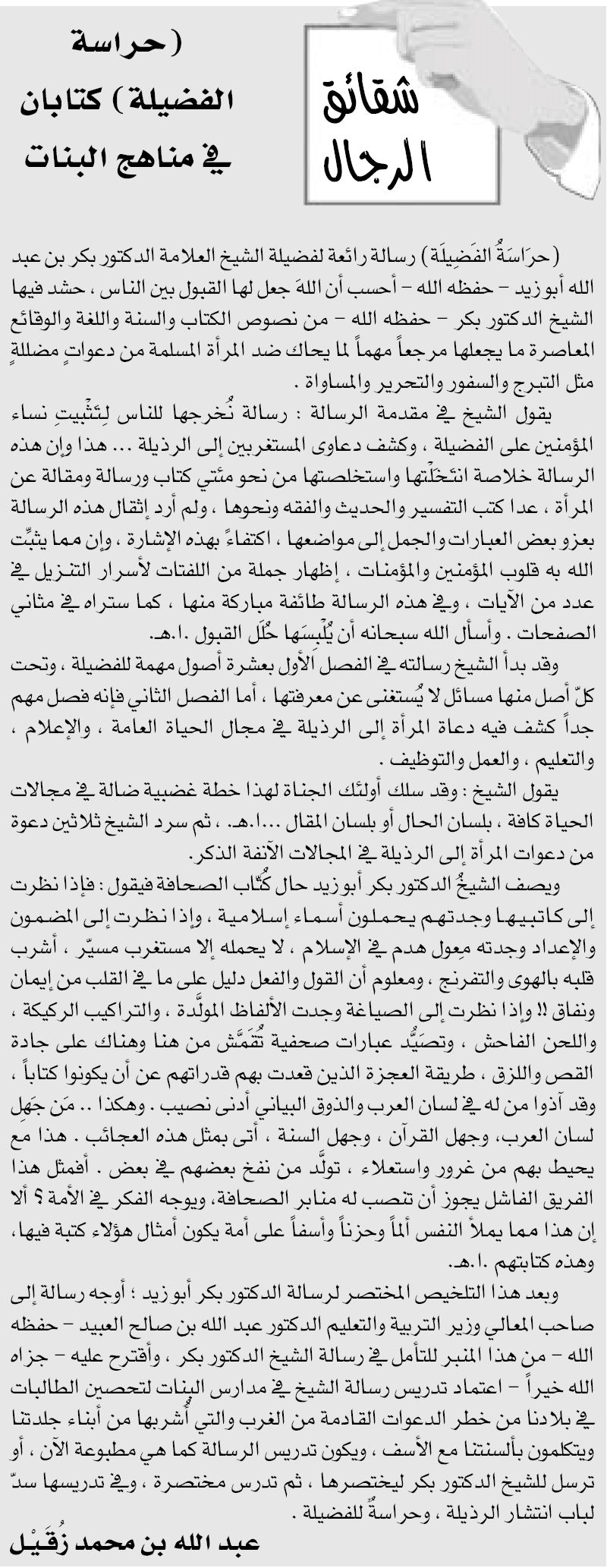 عليه - جزاه الله خيراً - اعتماد تدريس رسالة الشيخ في مدارس البنات لتحصين