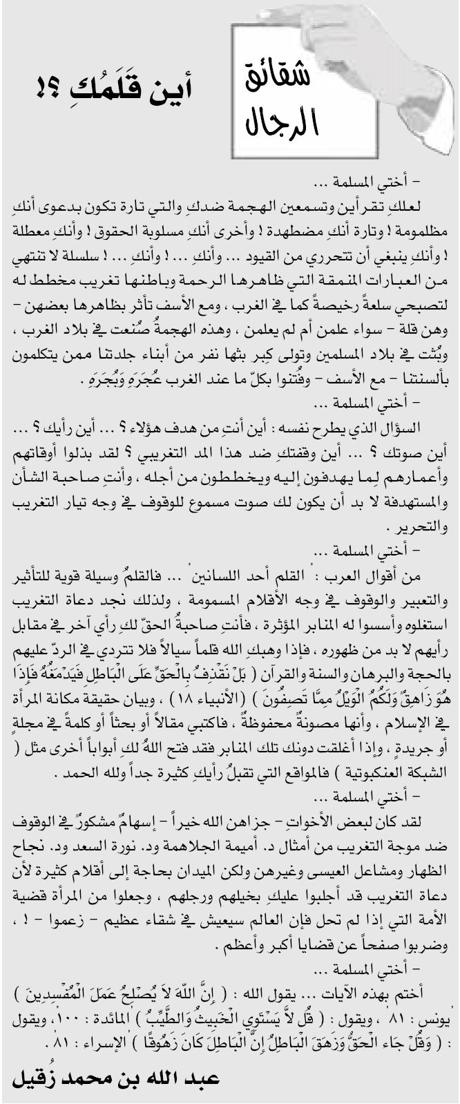 ومشاعل العيسى وغيرهن ولكن الميدان بحاجة إلى أقلام كثيرة لأن دعاة التغريب